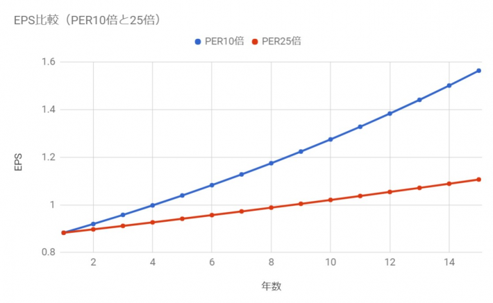 EPSの成長率にこれほどの差が出る理由は、PER25倍の方がPER10倍の方より株価が高いため、自社株買いの効率が悪いためです。