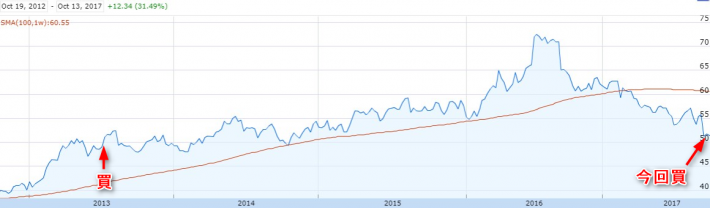 こうして長期のチャート(と言っても5年)で見ると、一時は$70以上までいっています。わたしのポートフォリオの中では2016年9月くらいまでかなり優秀な銘柄でした。そこから急降下しています。