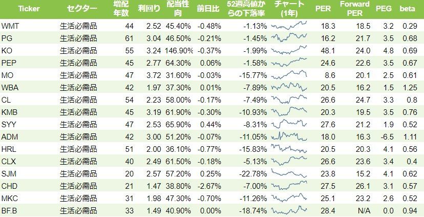 | Ticker | 会社名 | セクター | 増配年数 | 利回り | 配当性向 | 株価 | 前日比 | 52w下落率 | PER | F PER | PEG | beta |